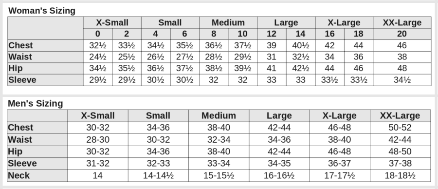 Clothing Sizes Table